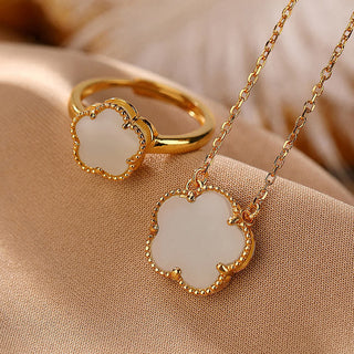 Buddha Gift 925 Sterling Silver Plated Gold Posts Hetian White Jade Tridacna Stone Camellia Flower Luck Necklace Pendant Ring Earrings