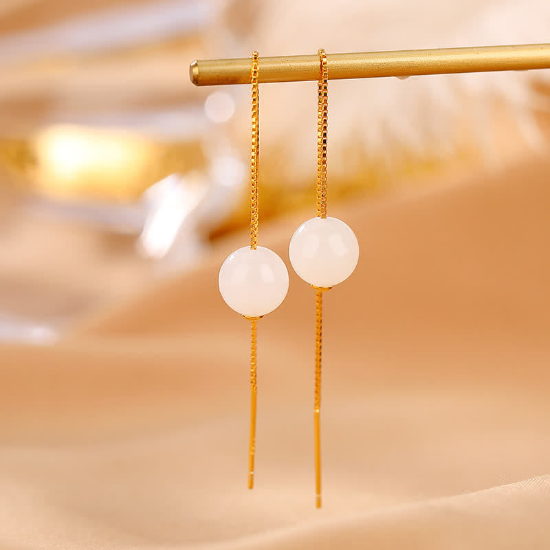 Buddha Gift 925 Sterling Silver White Jade Beaded Happiness Drop Earrings