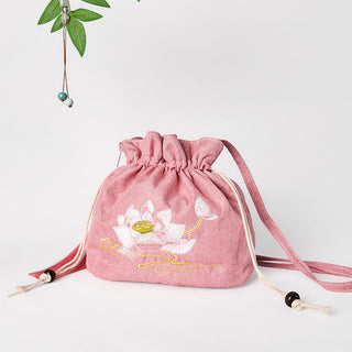 Buddha Gift Embroidered Light Pink Lotus Cotton Linen Crossbody Bag Shoulder Bag