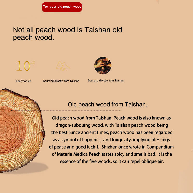 In ancient China, the northeast direction was known to be the devil's gate position. Therefore, two deities namely Shen Du and U Lei took charge of the area to prevent any evil spirits from entering the human realm. They were protected under a branch of the gigantic peach tree. Whenever they see any ghost entering the human realm they will tie the ghosts with hemp strings and throw them into a forest to be eaten by tigers. Since then, all ancient Chinese houses would have two panels carved from peach wood to be hung on doors to drive away evil spirits. Therefore, peach wood is considered to have the functions of luck, warding off evil spirits, and attracting wealth in traditional Chinese culture.