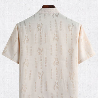 Buddha Gift Frog-Button Fu Character Dragon Bamboo Leaf Chinese Tang Suit Short Sleeve Shirt Linen With Pockets