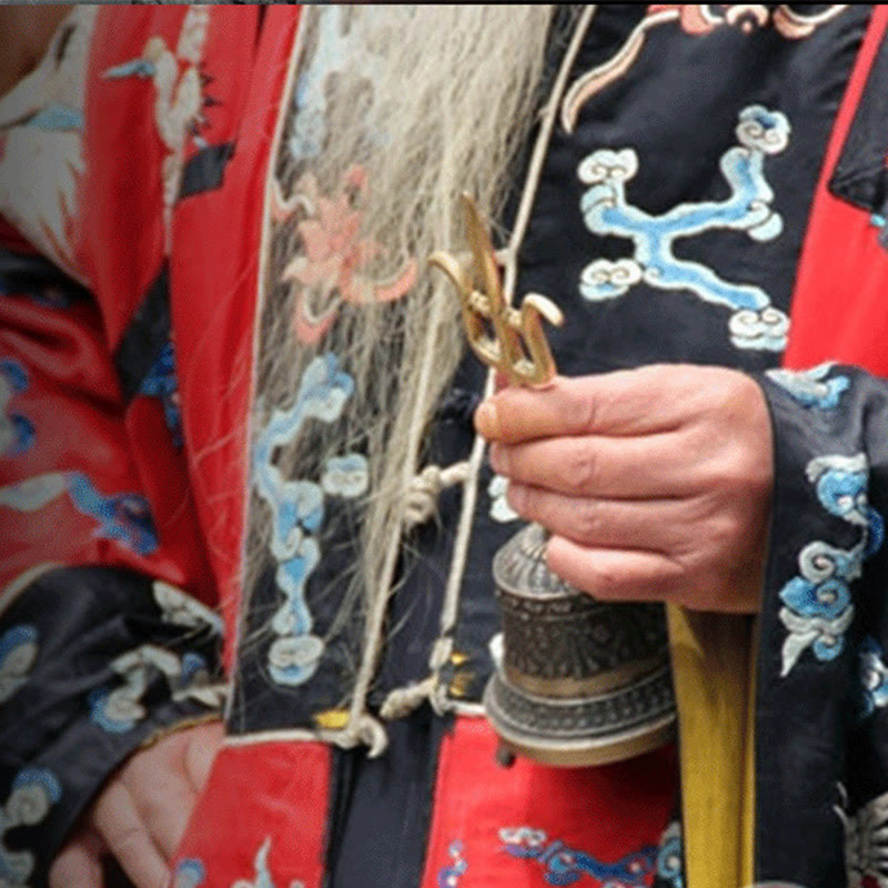 The vajra (symbolizing the male principle, fitness of action) is held in the right hand and the bell (symbolizing the female principle, intelligence) in the left hand, the interaction of the two ultimately leading to enlightenment.